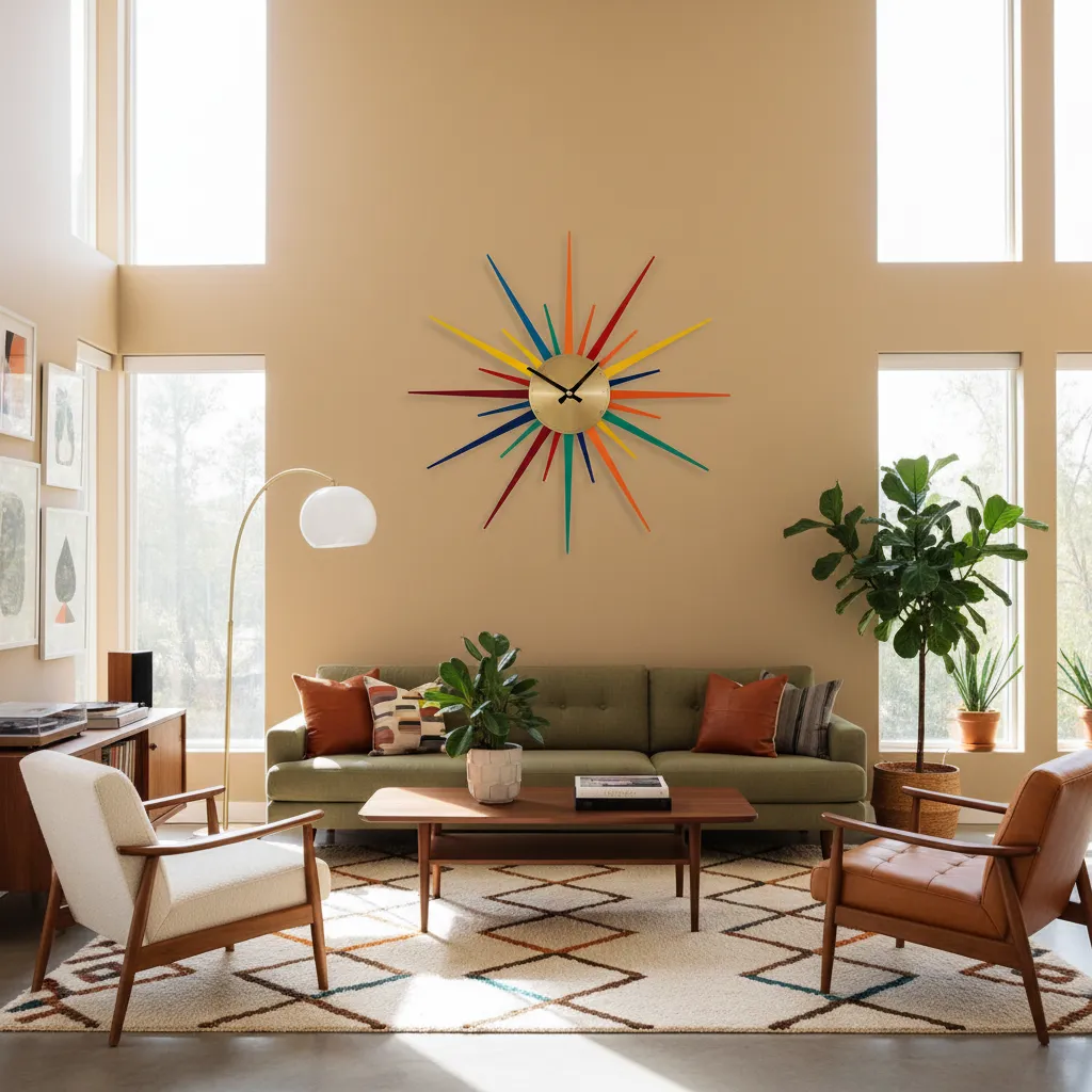 The starburst clock is an icon of the era. Choose one with multi-colored spokes to create a functional focal point on your wall. It captures the optimism of the atomic age and serves as a fun reminder not to take decor too seriously.