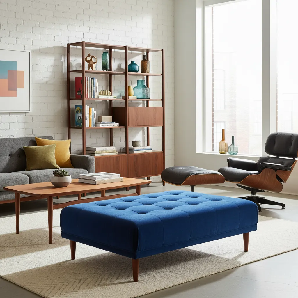 If committing to a large colorful sofa feels daunting, start smaller. A large, tufted sapphire blue ottoman can serve as a coffee table or extra seating. This burst of cool blue adds depth to a room dominated by warm wood tones. It is a practical piece of home decor that adds function and flair simultaneously.