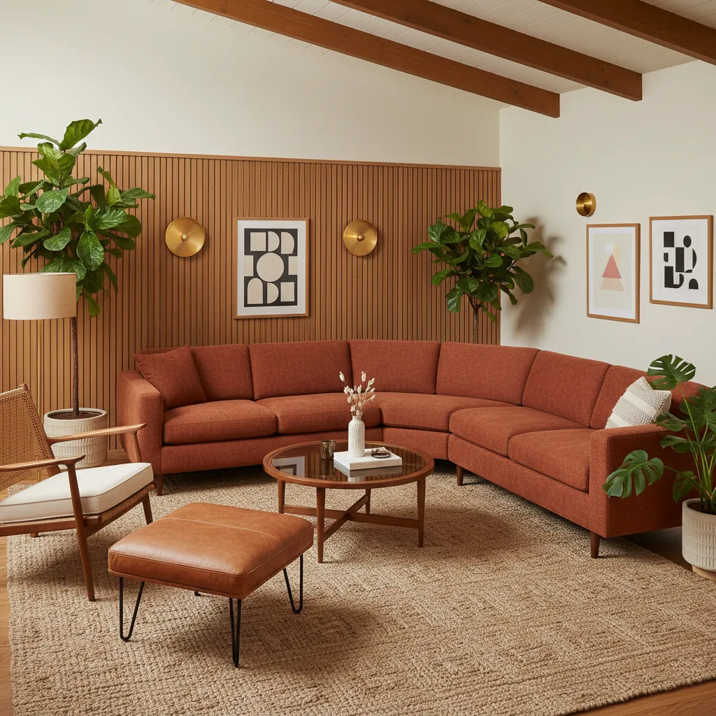 Terracotta brings an earthy warmth that instantly makes a living room feel grounded. A low-profile sectional in a rusty orange hue invites you to sink in and relax. This color works exceptionally well with natural materials like rattan, leather, and jute. It bridges the gap between modern design and organic comfort.