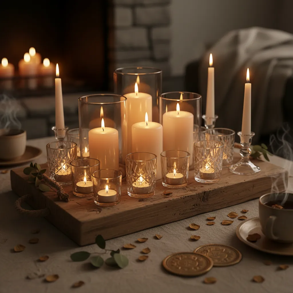 Nothing says cozy like the soft glow of candles. Use a mix of pillar candles, tea lights, and taper candles in varying heights. Place them in glass holders or on a wooden tray for a rustic touch.