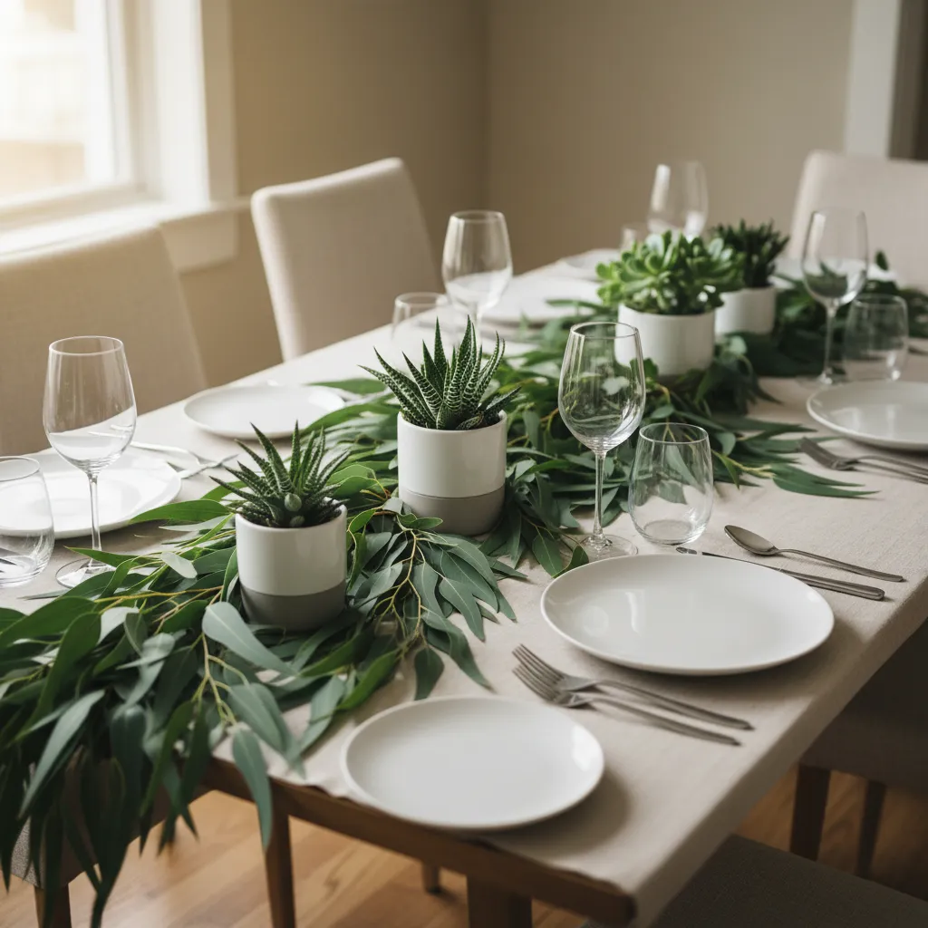 Bring the outdoors in with lush greenery. Use eucalyptus branches, potted herbs, or small succulents as part of your table decor. Greenery adds life and freshness to any setting.