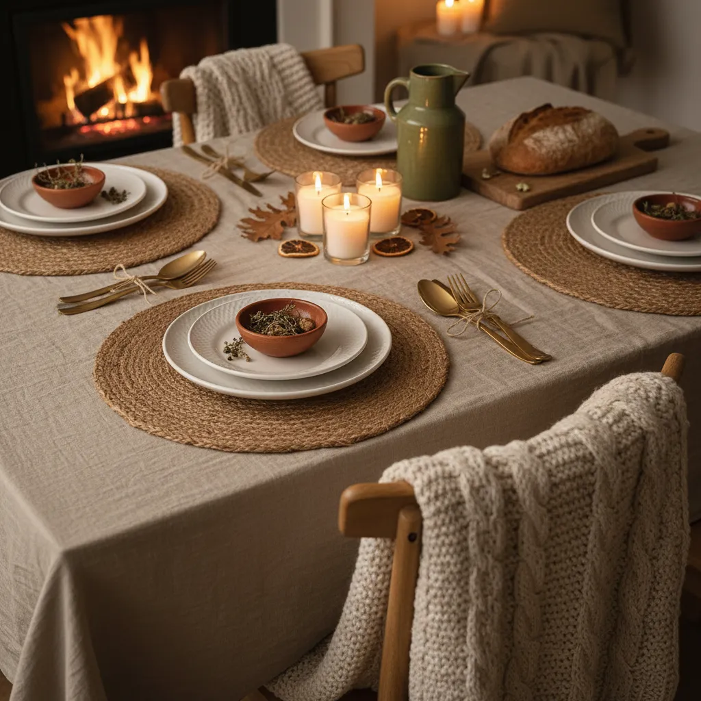Combine soft linens, woven placemats, and textured runners to create a warm, inviting table. Opt for neutral tones like beige, cream, or soft gray to keep the look cohesive. Add a chunky knit throw draped over a chair for extra coziness.
