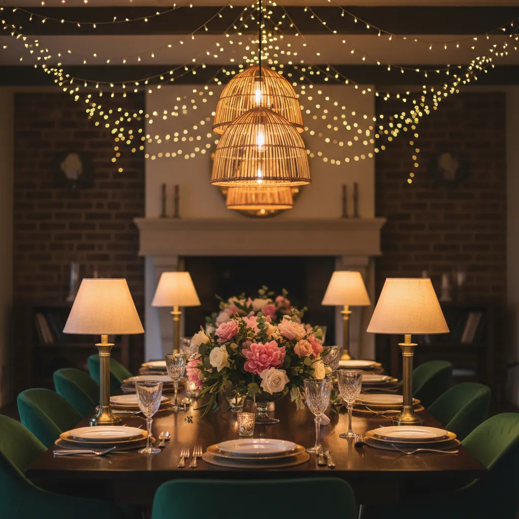 Combine overhead lighting with table lamps or string lights to create a warm, layered glow. This approach ensures your table feels cozy and inviting, even during evening gatherings.