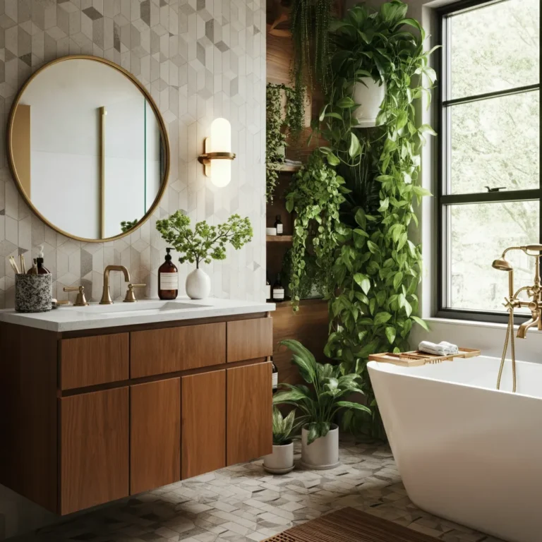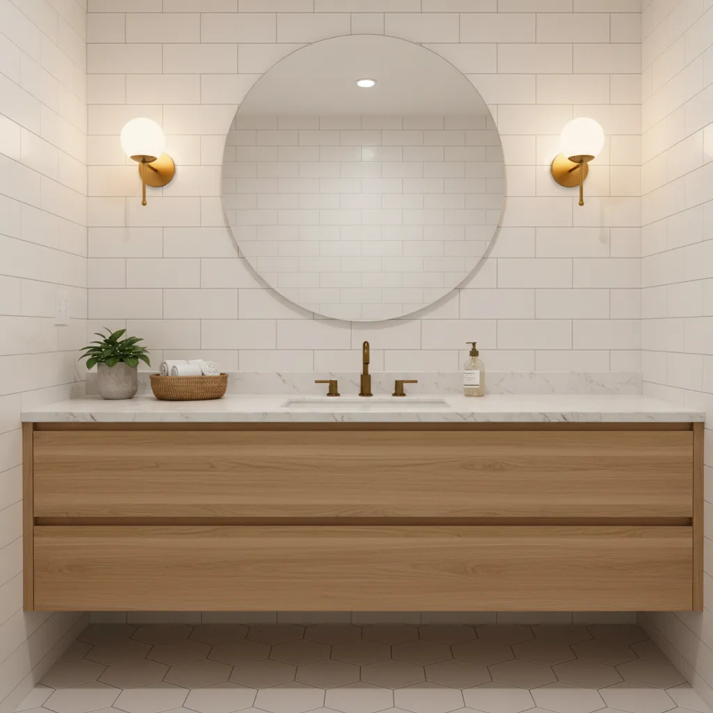 The best way is to layer in natural materials. Incorporate wood elements through your vanity, shelving, or accessories. Add texture with woven baskets, plush rugs, and high-quality towels. Finally, use warm lighting and metallic finishes like brass or brushed gold.