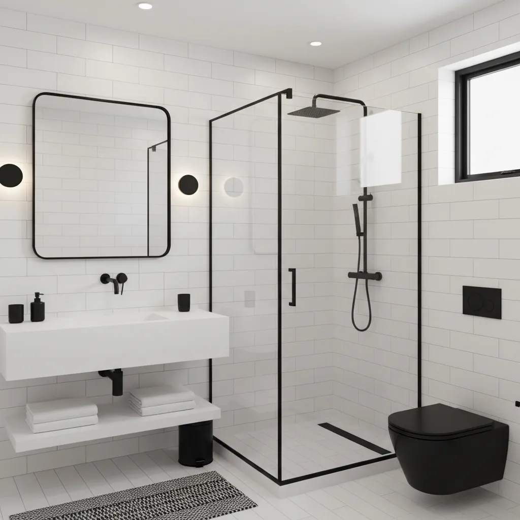 For a bold, graphic look, introduce black accents. This creates a classic and sophisticated feel. Think a black-framed shower screen, matte black faucets and hardware, or a mirror with a sleek black frame. The sharp contrast highlights the brightness of the white tile while adding a modern edge. This approach is fundamental to many Stunning Black and White Bathroom Decor Ideas.