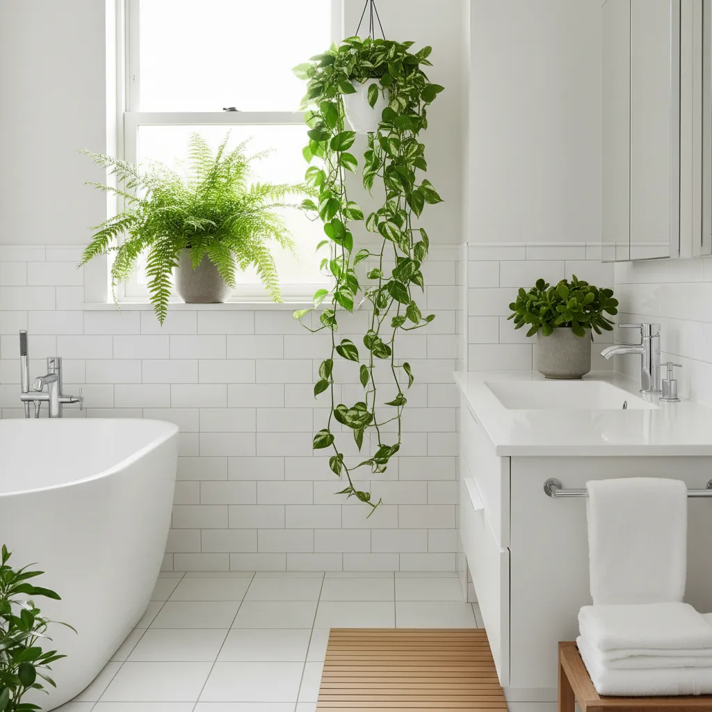 Plants are a must for adding life and a pop of natural color. A bathroom’s humidity is perfect for many types of houseplants. Place a potted fern on a windowsill, hang a trailing pothos from the ceiling, or put a small succulent on the vanity. The vibrant green of the leaves provides a refreshing contrast to the white tile and purifies the air.