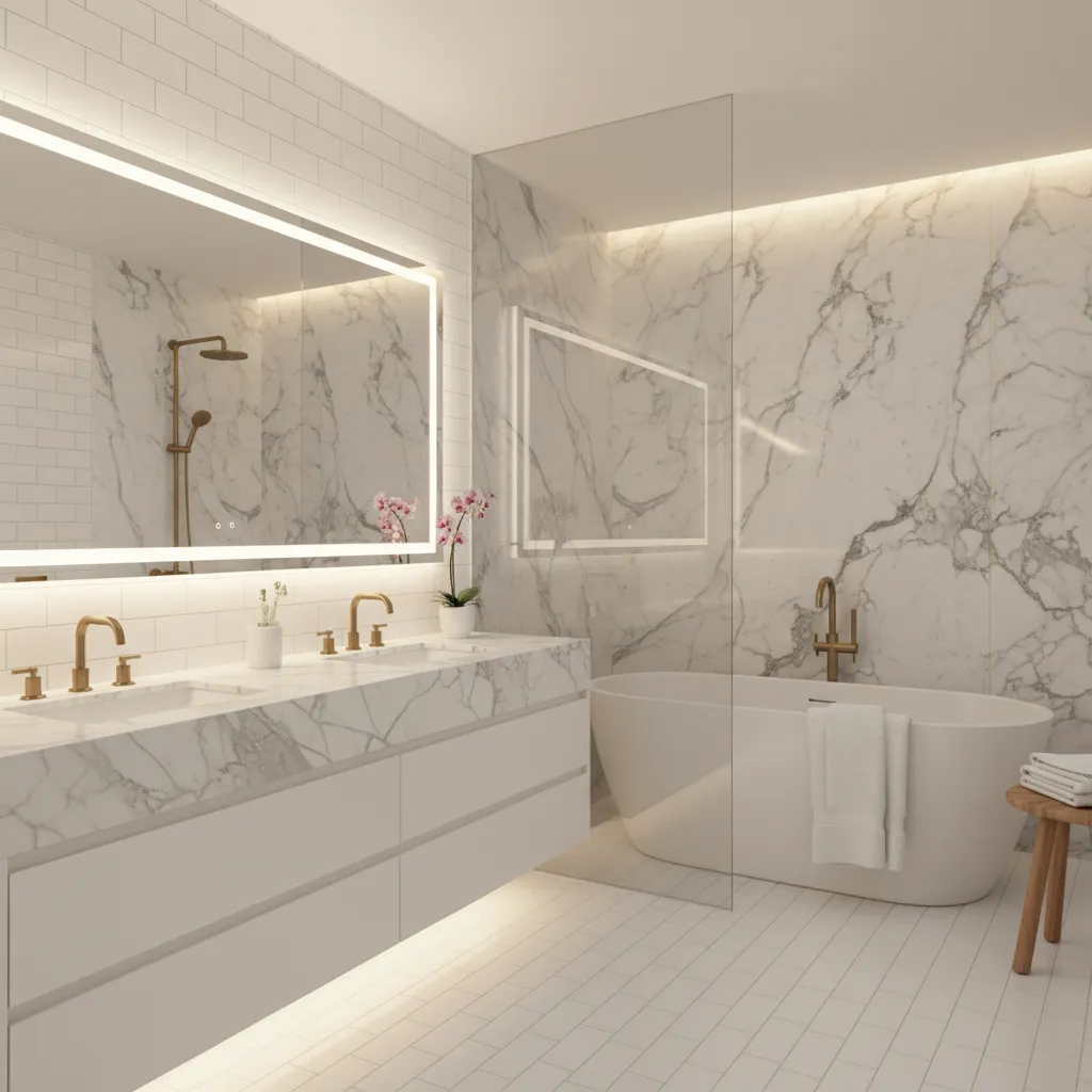 The finish of your faucets, showerhead, and cabinet hardware can dramatically affect the room’s temperature. While chrome is classic, consider warmer metals like brass, champagne bronze, or brushed gold. These finishes have a soft, inviting glow that stands out beautifully against white tile, adding a touch of understated luxury.