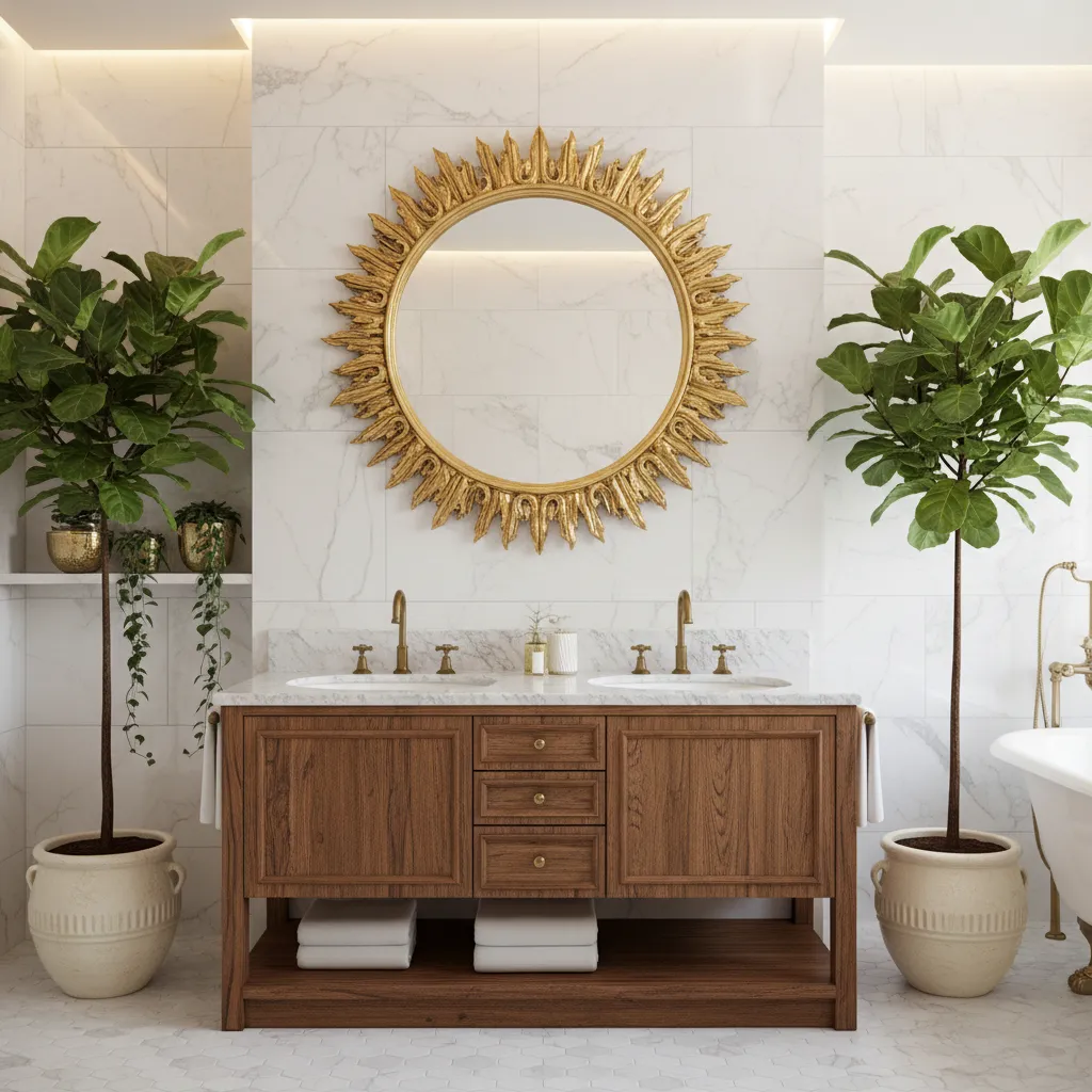 The mirror is often a focal point in the bathroom, so make it count. Instead of a simple, frameless mirror, choose one with character. An ornate vintage mirror with a gold frame can add a touch of glamour, while a round mirror with a thin wooden frame offers a softer, more modern look. The right mirror can act as a piece of art.