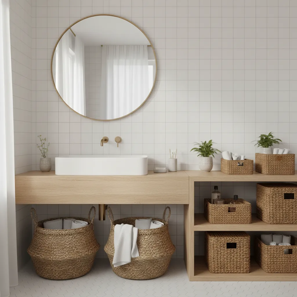 Swap out plastic bins for woven baskets made of seagrass, rattan, or wicker. Use them to store extra towels, toilet paper, or toiletries. These natural textures add a touch of rustic, bohemian charm and are a practical and stylish storage solution. This is a simple decor idea that aligns well with the coziness of Farmhouse Bathroom Decor Ideas.