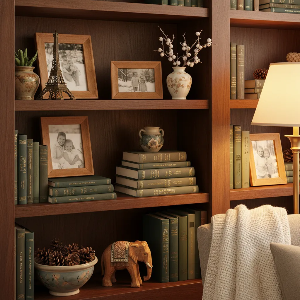 Reorganize your bookshelves or mantle. mix books with personal treasures—travel souvenirs, family photos in warm wood frames, or heirloom ceramics. Grouping items in odd numbers (threes or fives) usually creates the most pleasing visual arrangement. This makes the space feel uniquely yours.