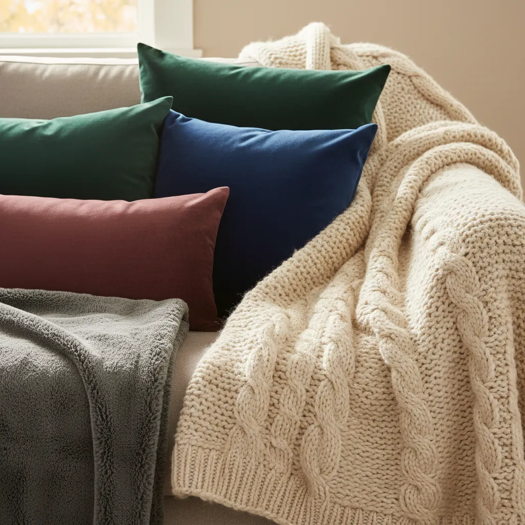 Warm neutrals like cream, beige, taupe, and gray serve as a base. Deep, rich accents in burgundy, forest green, navy, or burnt orange add seasonal depth and coziness.