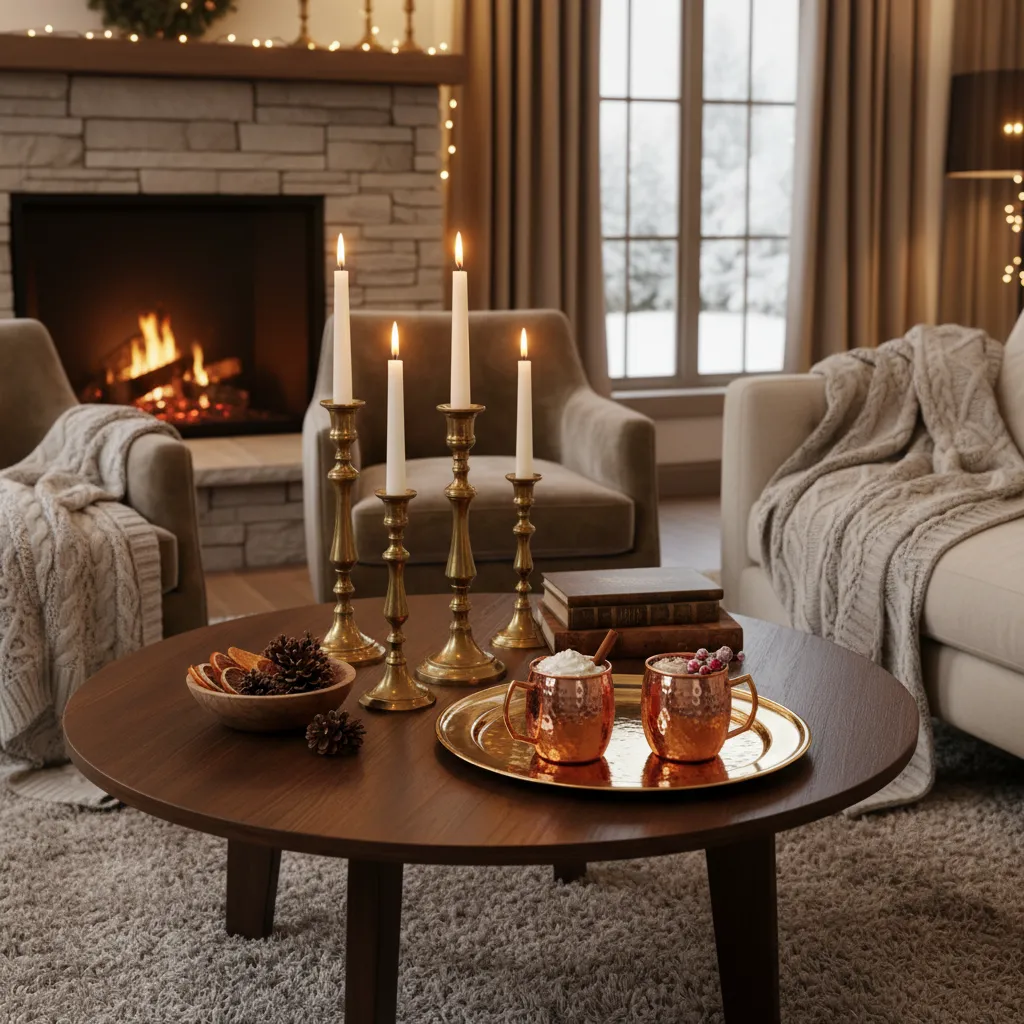 Focus on brass, copper, and gold rather than silver or chrome. A brass candlestick, a gold tray on the coffee table, or copper mugs displayed in the kitchen add a glow to your space. These warm metals catch the light from your lamps and candles, creating a subtle shimmer.