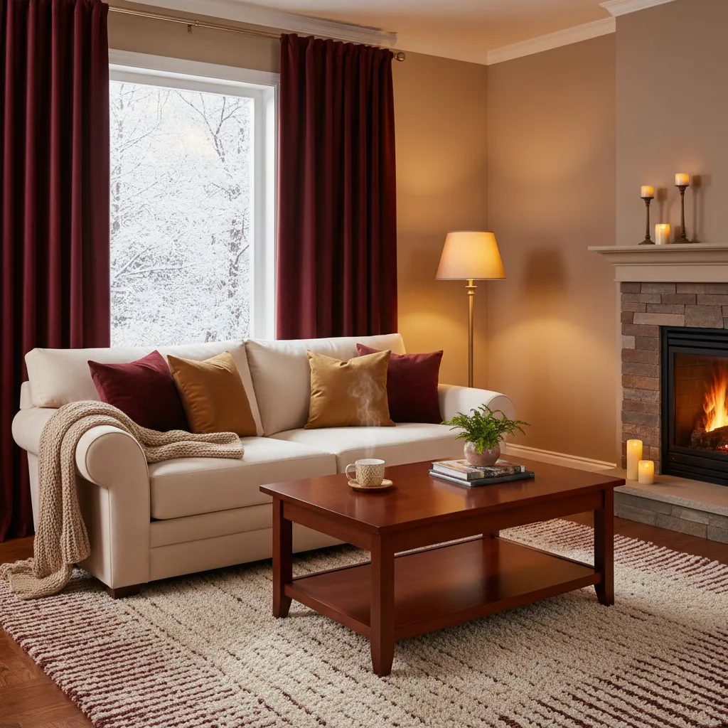 Replace sheer summer curtains with heavier drapes. Velvet or thick cotton curtains not only block drafts—saving on heating bills—but also soften the acoustics of the room. This makes your home sound quieter and feel more enclosed and private, which enhances the cozy factor.