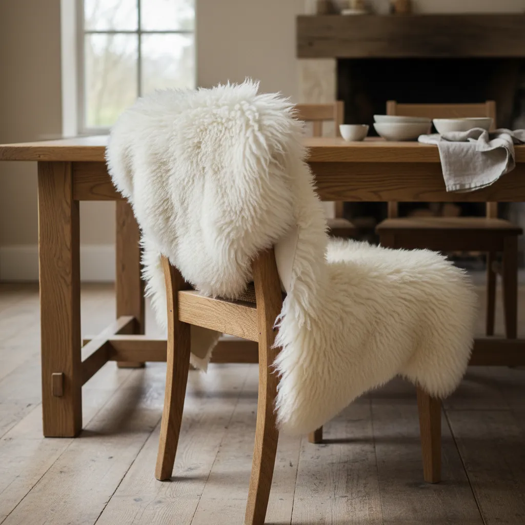 Toss a sheepskin pelt over a hard dining chair or a wooden bench. It instantly transforms a piece of furniture from “strictly functional” to “stay a while.” This is particularly effective in entryways or dining nooks where comfort is often sacrificed for style.