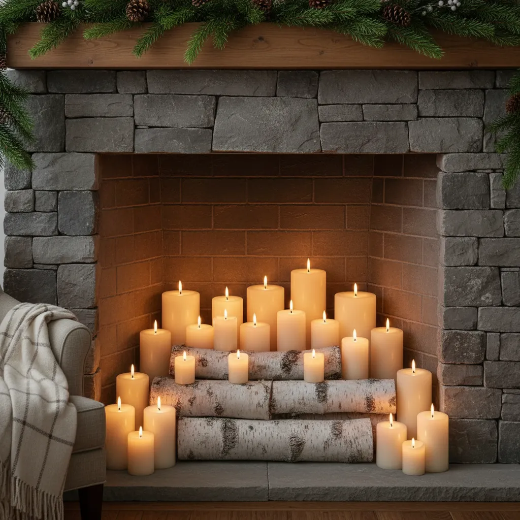 If you have a non-working fireplace, fill the firebox with birch logs or a cluster of pillar candles of varying heights. When lit, they give the same romantic glow as a real fire without the smoke. If you have no fireplace, group candles on a tray on your coffee table or use a mantle shelf to anchor the room.