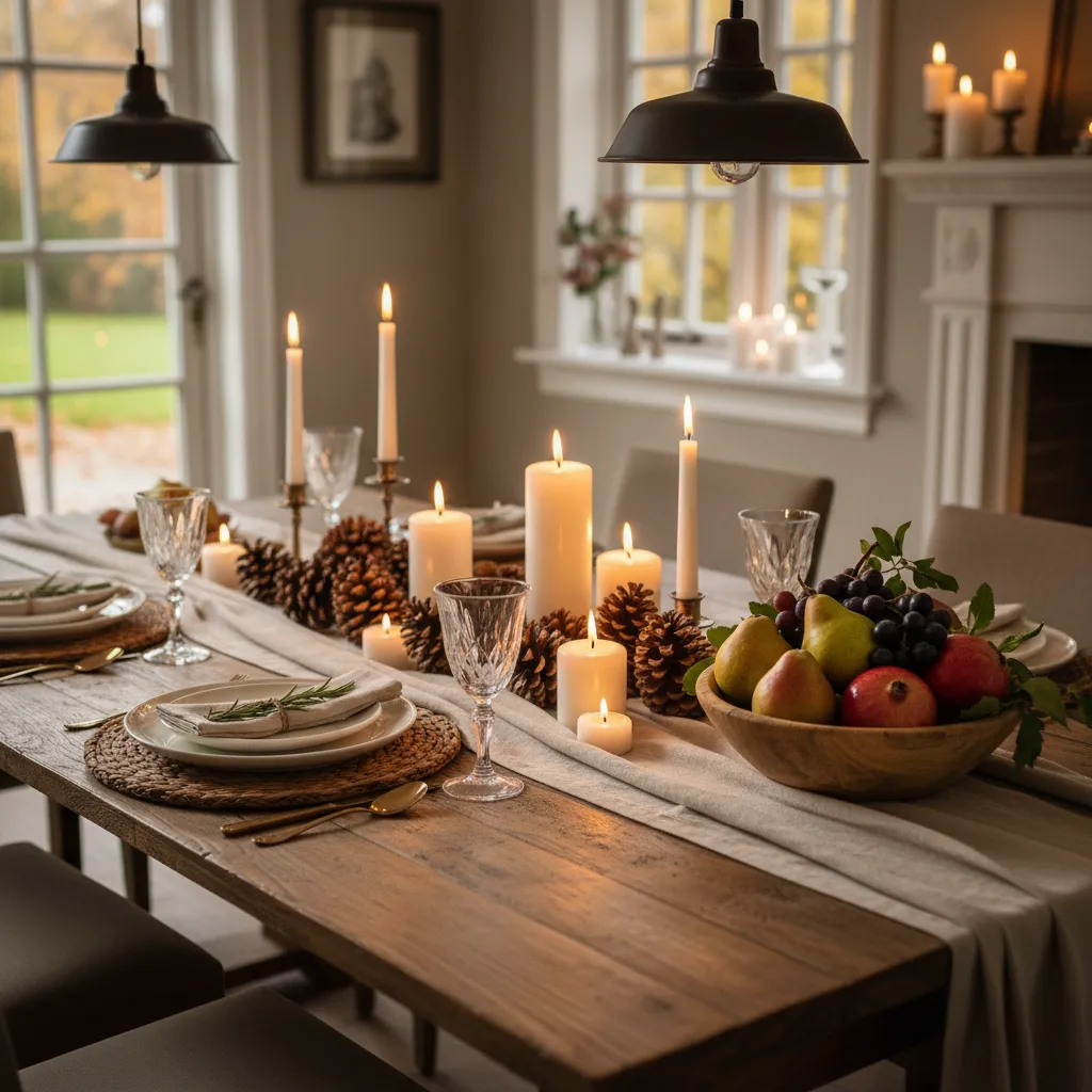 Ditch the placemats and go for a runner. A linen or burlap runner down the center of the table adds texture without feeling formal. Add a centerpiece of pinecones, candles, or a bowl of seasonal fruit like pears or pomegranates. It’s a simple decor idea that keeps the dining room from looking abandoned between meals.